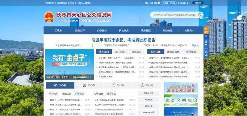 便民服务持续升级,在门户网站上全新推出“长者模式”专区,并整合司法行政资源,上线“一站式惠民公共法律服务”平台,提供法律咨询、援助、公证、调解等在线办理功能,让公共法律服务更加普惠便捷。截至12月中旬,天心区政府门户网站月均浏览量达20万次,累计发布政务信息33万余条,办结服务事项25万余件。作为“数字政府”建设的关键载体,网站将持续提升服务便捷化与智能化水平,致力于构建一个有温度、高效能、响应快的数字治理新平台。举报/反馈