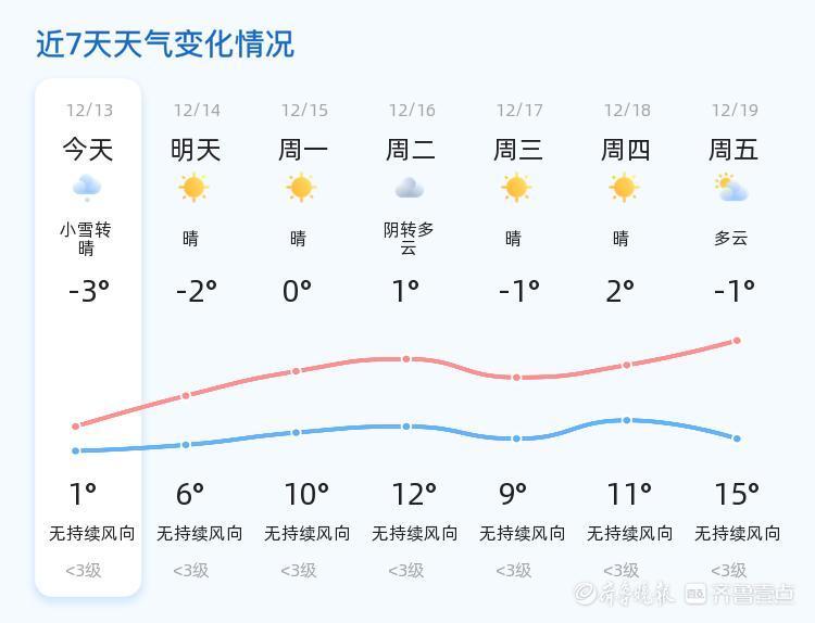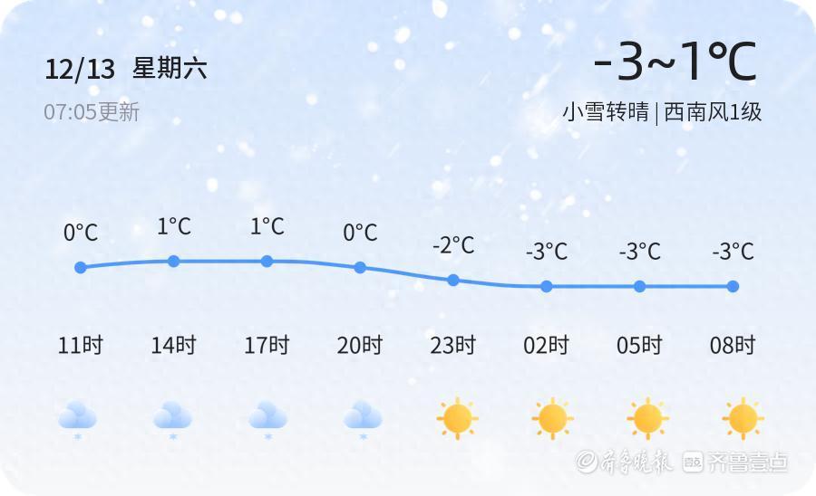 今天是12月13日,星期六,农历十月廿四。临沂市迎来小雪转晴的天气,气温在-3°C至1°C之间波动,整体天气寒冷。各区均出现小雪天气,风力较小,西南风1级,空气湿度较高,达到94%,PM2.5指数为63,空气质量良好。市民出行需注意防寒保暖,谨防道路湿滑。