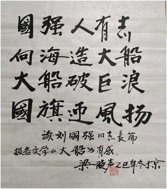 著名作家、茅盾文学奖得主、中国文坛的常青树,梁晓声先生读了《大船》非常振奋,为表达感想和对作品的赞许之情,很少写毛笔字的梁晓声先生欣然提笔挥毫,赠送刘国强一幅书法作品,写了如下诗句: